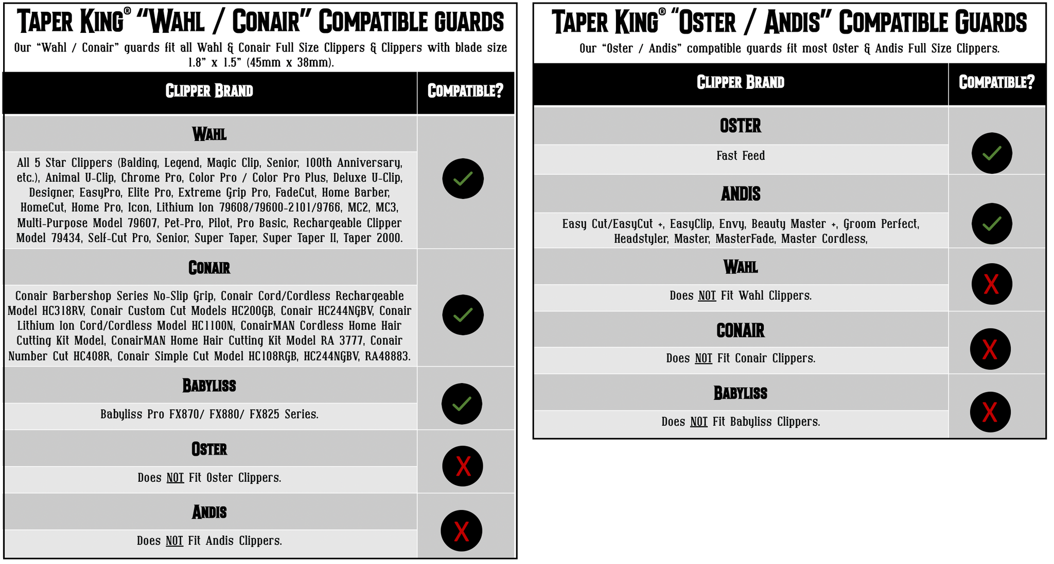 Please check the below charts to determine if our Taper King® guards will fit your clippers. If you have any questions about whether your clippers are compatible, please don't hesitate to send us an email.