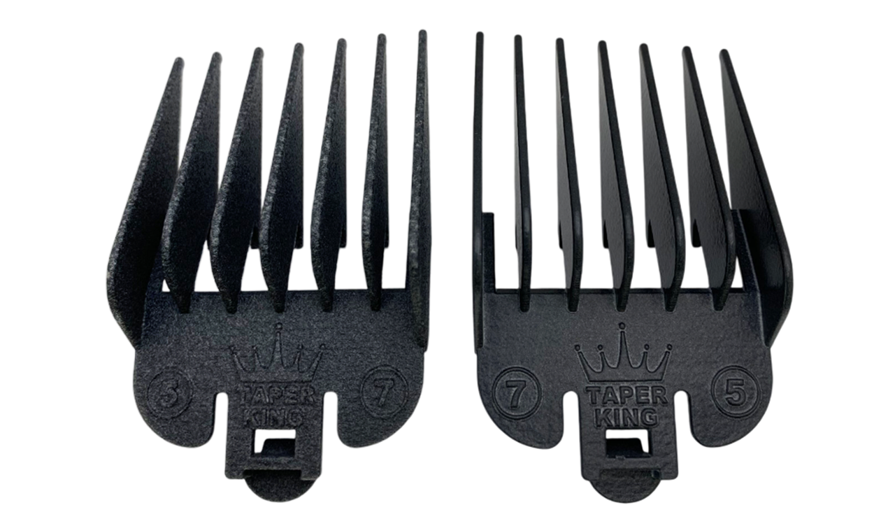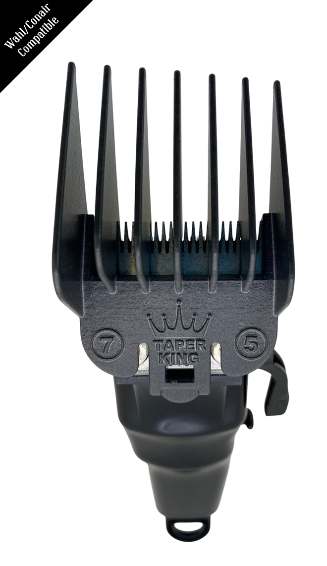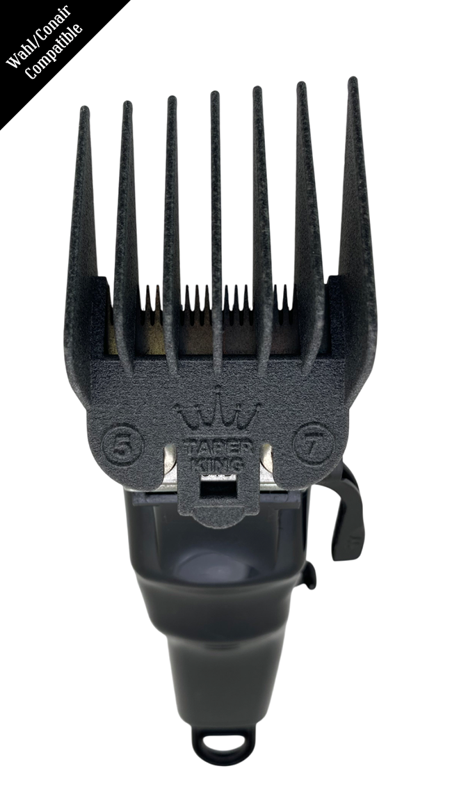 Simply clip on the Taper King Guide Comb onto your hair clippers to achieve the perfect taper or fade today (when ordering, be sure to select the guards that fit your specific clipper brand)!